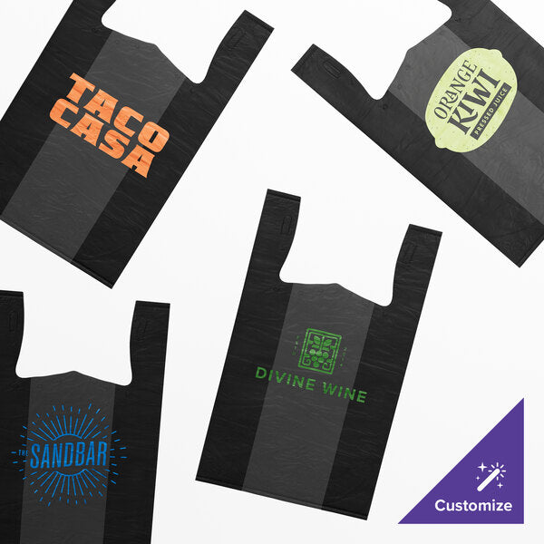Provide your customers with a convenient way to carry purchased merchandise by bagging items in this 1/6 size .51 mil black unprinted embossed standard-duty plastic t-shirt bag! Made from high-density polyethylene, this bag is built strong to resist rips and tears while in use. Not only is its size great for holding bulky items, its dual handles also ensure quick and easy transportation.
