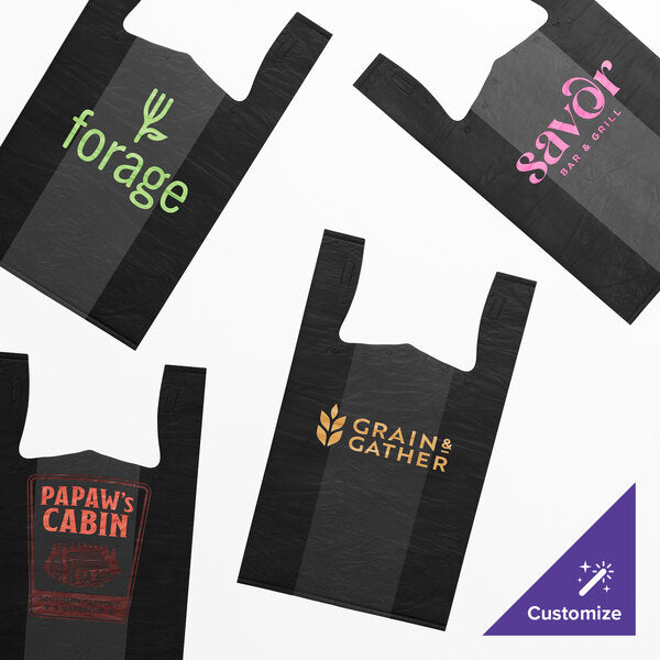 Provide your customers with a convenient way to carry purchased merchandise by bagging items in this 1/6 size .87 mil black unprinted embossed heavy-duty plastic t-shirt bag! Made from high-density polyethylene, this glossy, black bag is built strong to resist rips and tears while in use. Not only is its size great for holding bulky items, its dual handles also ensure quick and easy transportation.