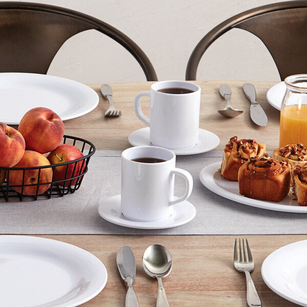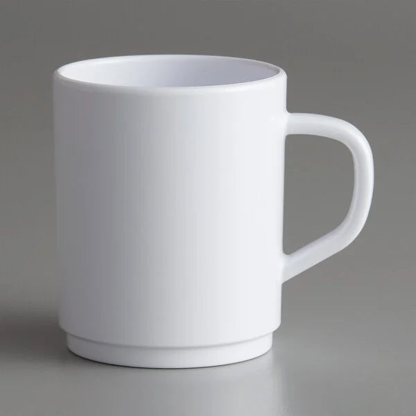 This 10 oz. white mug. Featuring a crisp white color and traditional design, this mug  delivers a classic look that will complement any table setting. A great size for providing light servings of coffee or tea, the mug also features a stackable design that will help you optimize limited storage space. BPA Free. Dishwasher Safe. Microwavable. NSF Listed. Stackable.