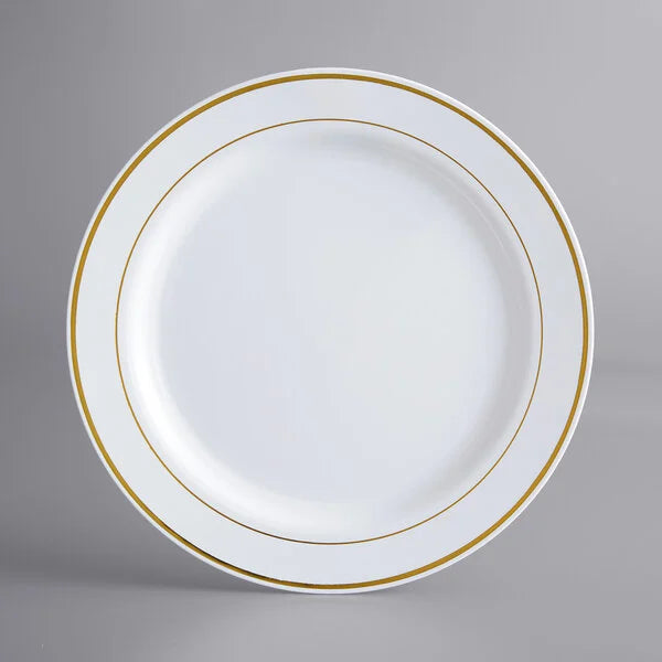 Featuring a classic gold band pattern along the wide outer rim, this plate's contrast between rim and stark white body is sure to draw attention while adding an upscale look to your wedding receptions, banquets, or other catered events.
