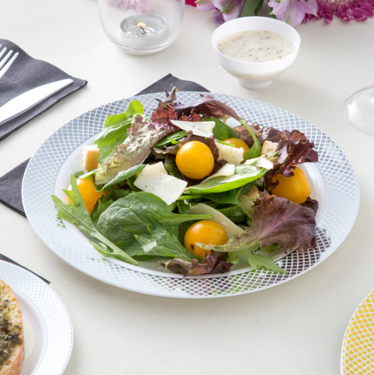Providing the look of china at a fraction of the cost, this Visions 10" white plate with silver lattice design gives you the appearance you want with the convenience you need! It's disposable to eliminate time wasted washing dishes, and has none of the related storage and transport costs of real china. Plus, the attractive appearance makes it ideal for elegant dining environments where real china simply isn't feasible or desired!