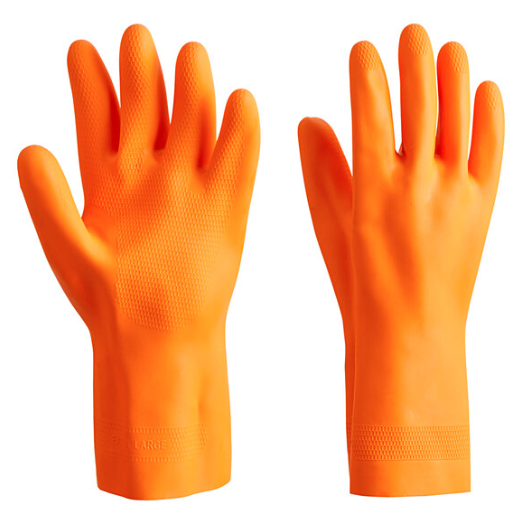 For reliable protection in a variety of applications, choose these 12" orange 28 mil neoprene / latex gloves. These anatomically-shaped gloves feature a 28 mil latex construction with a neoprene layer. The pure cotton flock lining absorbs perspiration to provide better comfort to the user, and the gloves are chlorinated for improved chemical resistance. Additionally, these gloves feature an anti-slip grip pattern that provides a good grip in both wet and dry conditions.