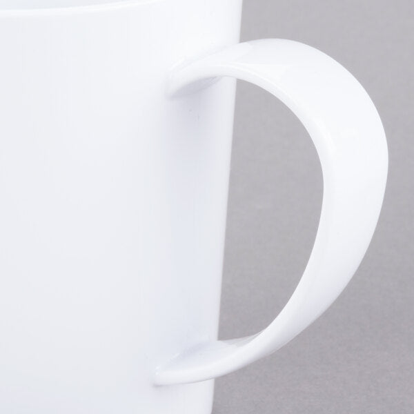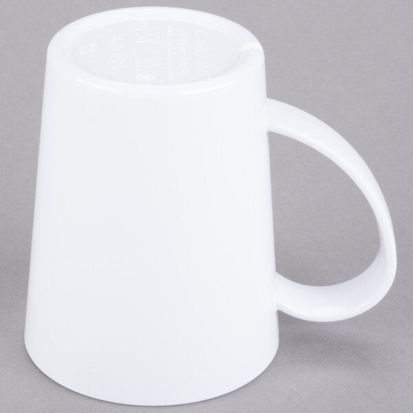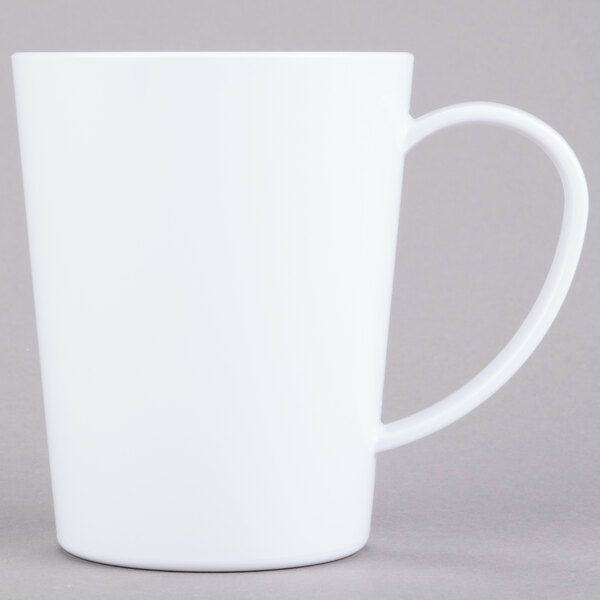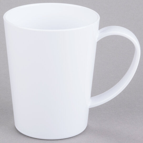 Serve piping hot coffee, tea, or hot chocolate without the threat of breakage with this 12 oz. white mug! It features a break-resistant TRITAN® construction that gives you and your staff an elevated sense of security, while its specially-designed large handle allows for easy holding to keep fingers away from hot liquids. This contemporary-styled mug nests with similarly-sized mugs for space-saving storage. It's safe for temperatures up to 180 degrees Fahrenheit. BPA Free. Dishwasher Safe. Microwavable. NSF Listed. Available in assorted colors.