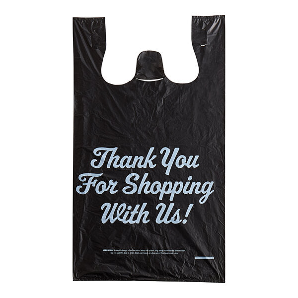 Measuring 21 microns thick, this large bag eliminates the need for double bagging heavy products and is versatile enough for use with food or retail items. It boasts a glossy, black color and features a courteous, printed, white graphic on the front that will show guests that you care. Plus, in comparison to traditional paper bags, this bag's plastic construction makes it easy to open and pack items for fast, efficient service that will keep your lines moving steadily. Handy, durable, and cost-efficient, this plastic bag is the perfect bagging solution for grocery and convenience stores, bakeries, coffee shops, and restaurants.