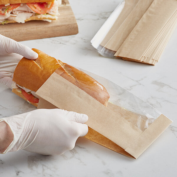 Increase impulse sales by showcasing your best sandwiches and subs with this 4 1/2" x 2 1/4" x 8 1/2" kraft window sandwich / bakery bag. This bag features a crystal-clear full view window that ensures guests get a good look at your food from the top and side of the bag. Better yet, fill it up with a few tasty cookies or pastries and set them on display to increase impulse purchases of your delicious baked goods. At 8 1/2" in length with a gusset of 2 1/4", this bag is large enough to hold sandwiches and subs.