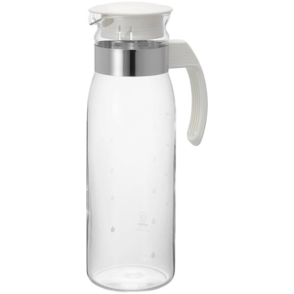 Serve your guests with ease when you use this slim 48 oz. glass pitcher with white lid and handle! Pouring from this pitcher is simple, just tilt it. The lid stays in place while in use, and the spout at the top makes for accurate and easy pouring! It features measurement markings on the side, allowing the user to clearly see how much is in the pitcher and how much has been poured. The heatproof glass is resistant to the transfer of odor and color and it makes it perfect for storing your drinks in the refrigerator. Available in colors: white, blue, and  grey. Dishwasher safe. With lid.