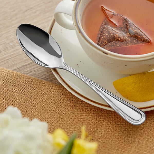 Complete your table setting with this 5 3/4" teaspoon. Your guests are sure to appreciate the sturdy construction of this flatware, and it won't break your budget! Made of stainless steel, it will be a long lasting and attractive addition to your busy dining area. It is great for completing table settings at bistros, cafes, and catered events.