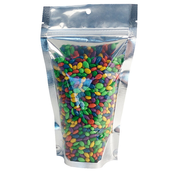 Securely package supplies with this 5" x 8 1/2" 3 mil silver metallized / clear plastic zip top stand-up pouch with hanging hole. Manufactured from a blend of PET film, silver metallized PET film, and linear low-density polyethylene, this plastic bag provides the perfect barrier between contents and airborne contaminants like dirt or debris. It also meets USDA-approved specifications for safe food service and handling applications. This allows you to store a variety of miscellaneous items ranging from fresh produce and raw materials to perishables like nuts and candies. Plus, the pouch features a zip top and hanging hole for secure closure and convenient storage!