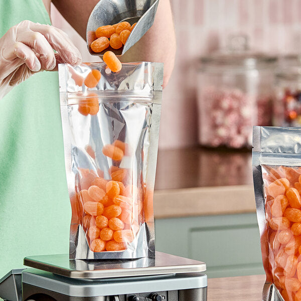 Designed for superior durability, this 3 mil product offers optimal strength with enough flexibility to fit your needs, which makes it less susceptible to damage than other bags and perfect for holding sharp or heavy objects. Its K-style construction also features 3/8" seals on three sides and two angled seals at the bottom for increased reliability. Additionally, its 3" bottom gusset allows you to stand the bag up while it is being filled. Plus, its clear front enables fast identification of contents, while its silver metallized back offsets your products nicely. The zip top also supplies a secure closure, and the wide top lip can be heat-sealed to ensure that the bag's contents aren't tampered with before they reach your customers. The lip even includes a tear notch for convenient opening when the time comes. Ideal for safe packaging and storage of items, this pouch is a versatile addition to any establishment!