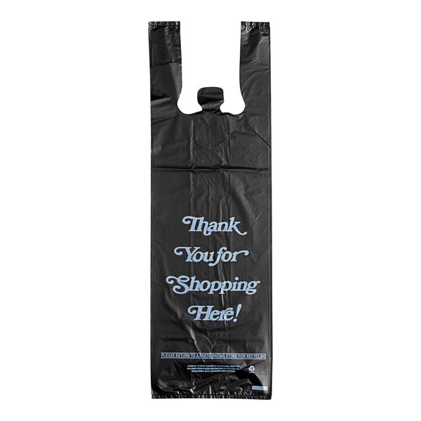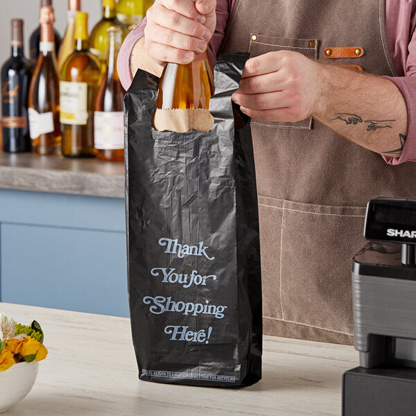 Measuring 25 microns thick, this extra heavy-duty liquor bag eliminates the need for double bagging heavy products. It boasts a glossy, black color and features a courteous, printed, gold graphic on the front that will show guests that you care. Plus, in comparison to traditional paper bags, this bag's plastic construction makes it easy to open and pack items for fast, efficient service that will keep your lines moving steadily. Handy, durable, and cost-efficient, this plastic bag is the perfect bagging solution for liquor stores and wineries.