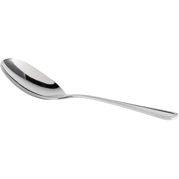 Create a sophisticated table setting with this  8 3/4" 18/8 stainless steel extra heavy weight solid spoon. Your guests are sure to appreciate the sturdy construction of this flatware, and it won't break your budget! Made of stainless steel, it will be a long lasting and attractive addition to your busy dining area. It is great for completing table settings at bistros, cafes, and catered events.