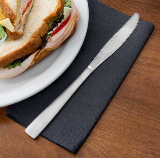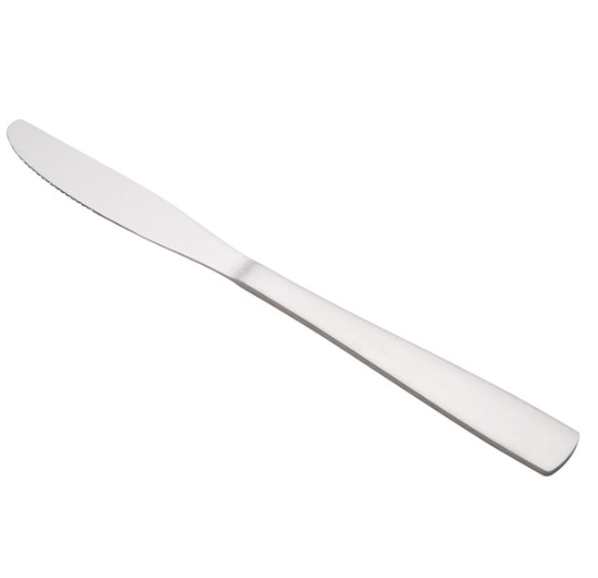 Enhance the look of your tabletop presentation with this 8 5/8" dinner knife. Your guests are sure to appreciate the sturdy construction of this flatware, and it won't break your budget! Made of stainless steel, it will be a long lasting and attractive addition to your busy dining area. It is great for completing table settings at family restaurants, bar and grills, and cafes.