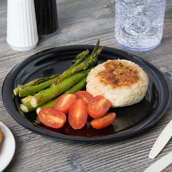 Perfect for service in schools, retirements communities, healthcare facilities, or casual dining restaurants, this plate is a durable addition to your establishment. Thanks to its 8 7/8" size, this plate is ideal for serving entrees, pasta dishes, and lunch specials. This plate withstands the daily rigors of a high-volume kitchen. Round shaped. BPA Free. Dishwasher Safe. NSF Listed. Available colors: black, white, tan, and red.