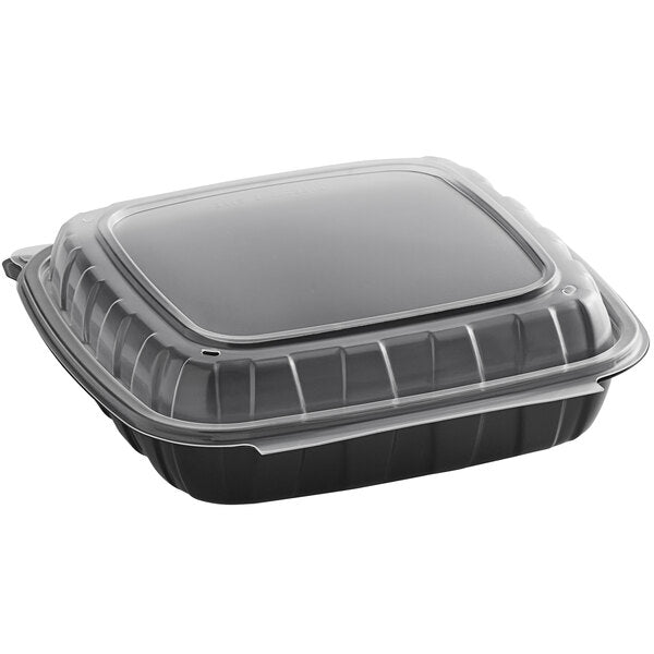 Give your guests an excellent take-out experience with this 9" x 9" x 3" microwaveable 1-compartment black / clear plastic hinged container! This container offers an ample capacity that's perfect for holding specialty meals from restaurants, bars, buffets, catering companies, or ghost kitchens. It features a 100% recyclable design to help reduce your impact on the environment! Plus, its flat top and bottom ensure easy stacking in to-go bags. Great for packaging pastas, sandwiches, salads, or hot dishes, this item is a versatile addition to any establishment. Durable Construction