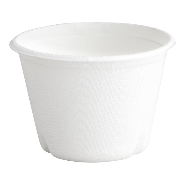 This compostable sugarcane / bagasse 4 oz. portion cup is the perfect addition to eco-conscious businesses.  If you're looking for the convenience of disposable products without the environmental impact of plastic or foam, look no further than this EcoChoice portion cup! While its bright white coloring provides a crisp, clean appearance that'll impress your guests, its capacity allows you to expertly portion out liquids to minimize waste and reduce replacement costs. Extremely Versatile