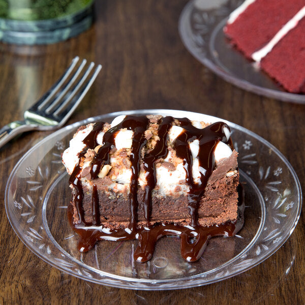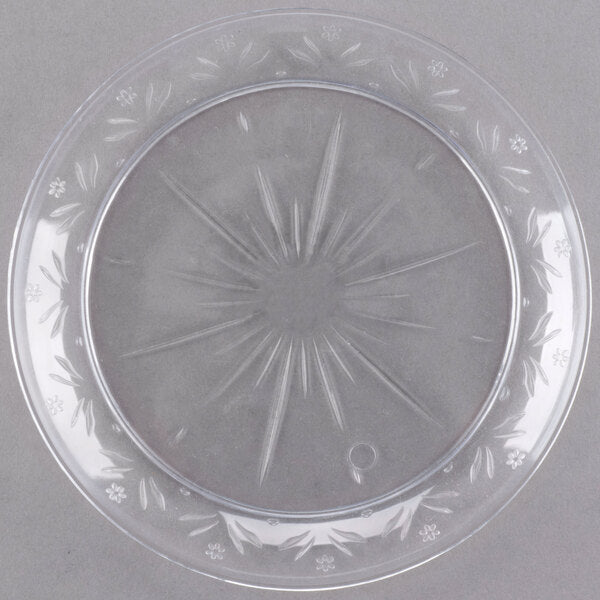 Boasting intricately detailed designs on its smooth surface, this plate's crystal-clear construction expertly showcases colorful side dishes and your signature, chocolate-drizzled desserts. Plus, it can easily be disposed of for fast clean up once your party or event is over. This plate is the perfect solution for elegant yet convenient dining at any venue!