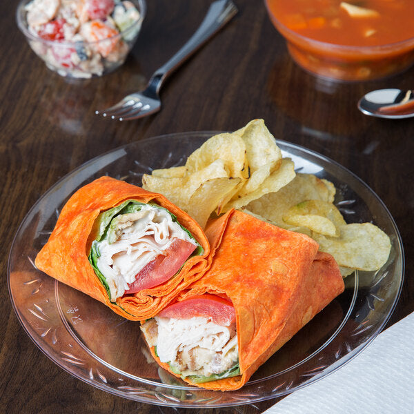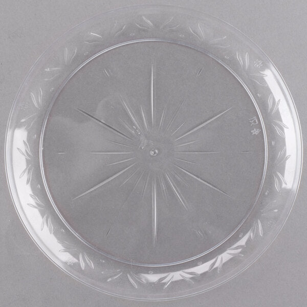 Boasting intricately-detailed designs on its smooth surface, this plate's crystal-clear construction expertly showcases colorful appetizers, classic tossed salads, and your signature grilled chicken entrees. Plus, it can easily be disposed of for fast clean up once your party or event is over. This plate is the perfect solution for elegant yet convenient dining at any venue!