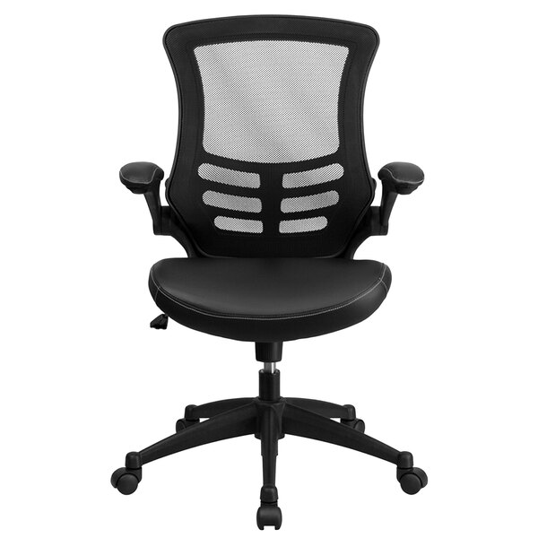 Mid-Back Black Mesh and Leather Office Chair with Flip-Up Arms and Nylon Base