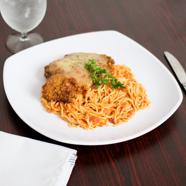 Upturned corner 11 1/2"  square melamine plate to highlight your signature entrees. This plate is sleek yet classic, with a square upturn for visual appeal. Dishwasher safe, this plate can easily be cleaned so that you can immediately reuse it. It is also safe for temperatures up to 212 degrees Fahrenheit. BPA Free. Dishwasher Safe. NSF Listed. Square shaped. Color: white.