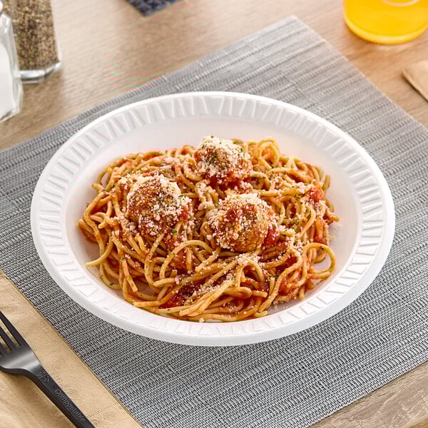 Easily serve entrees and side dishes with this 9" white non-laminated round foam plate. Offering the same Dart quality as comparable laminated versions, this foam plate is lighter than standard plastic plates and is perfect for your picnic, party, buffet, or other catered event. To reduce messes and spills, it boasts deep shoulders and a wide rim. Plus, it has a non-absorbent foam construction that also prevents liquids from leaking through.